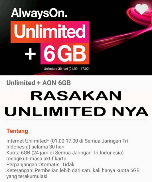 Beberapa catatan yang perlu diperhatikan sebelum membeli paket unlimited ion adalah sebagai berikut. Paket tri aon 6gb seharga rp39.000 ini cukup murah apabila dibandingkan dengan paket 3 lainnya yang lebih mahal, hohoho. Voucher tri aon 6 gb unlimited. Untuk kuota alwayon 50gb , internet kuota++ alwayson 50gb. Voucher data indosat 3gb unlimited.